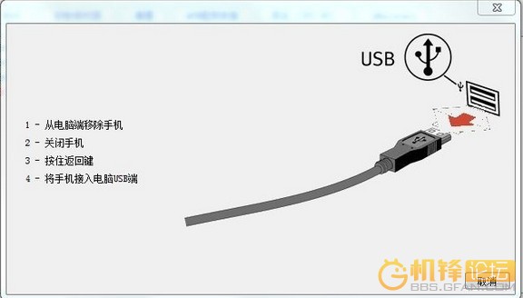 第七、按照我的指示、把手机关机超过30秒(或者拔电池5秒钟以上) 第八、在手机的关机状态中按着返回键的同时、插上数据线连接电脑、 第九、等几秒钟开始自动刷机、