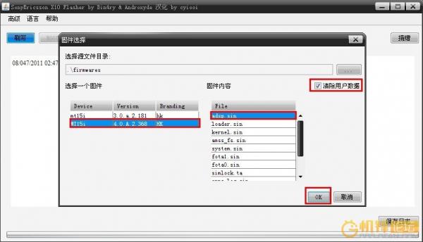 第四、然后打开 FlashTool目录下 X10FlashTool.exe点刷写 第五、弹出窗口,在窗口里可以看见里面的固件内容及信息 把清除用户数据勾上直接点OK(不要选择任何机型、直接刷写即可)